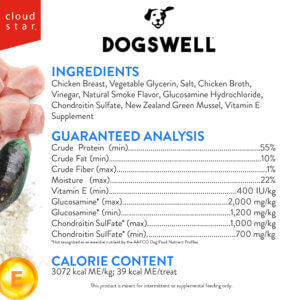 Chicken, Vegetable Glycerin, Salt, Chicken Broth, Vinegar, Natural Smoke Flavor, Glucosamine Hydrochloride, Chondroitin Sulfate, New Zealand Green Mussel, Vitamin E Supplement.